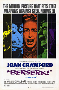 After Robert Aldrich brought their careers back to life with Whatever Happened to Baby Jane?, Bette Davis and Joan Crawford alike spent a lot of their time inflating the budgets of what would otherwise have been extremely cheap horror films. For Crawford, that meant teaming up successively with two independent producers who first drew attention to themselves toward the end of the previous decade. First came William Castle, who used her residual fame to help wean him away from dependence on loopy promotional gimmicks. Then it was Herman Cohen’s turn. Cohen’s name isn’t nearly as widely remembered as Castle’s, but it probably ought to be, since he was the mastermind behind American International Pictures’ late-50’s teen-monster cycle. Afterwards, he became AIP’s man on the ground in Great Britain, presiding over movies like The Headless Ghost and Konga. Cohen was still operating in the Isles when he got his hands on Crawford, casting her in Berserk, his bid to get in on the on-again, off-again 1960’s vogue for circus-themed horror flicks. It’s been a difficult season for the Rivers Circus, and when the show’s star performer, a tightrope walker named Gaspar (Thomas Cimarro), falls to his death in a freak accident right in the middle of his act, co-owner and business manager Albert Dorando (Michael Gough, from Dr. Terror’s House of Horrors and The Skull) is just about ready to hang it up for the year. In fact, Dorando would just as soon sell out his interest in the circus to his longtime partner, Monica Rivers (Crawford), from whose family the circus takes its name. Monica, however, does not care for that plan, partly because she lacks the cash on hand to buy Dorando out, but also because she considers his defeatist attitude to be premature. In fact, she is convinced that Gaspar’s grisly fate actually heralds a major turnaround in the circus’s fortunes. Reasoning from the well-established morbidity of the paying public, she predicts (correctly, as it turns out) that tomorrow’s show will have the biggest turnout of the tour so far, and with that in mind, she puts Dorando to work bothering all the agents in his rolodex in order to find some exciting new act to put on in Gaspar’s place. As it happens, none of Dorando’s contacts come through in a manner satisfactory to Monica, but a freelancer from America wanders in on his own initiative with an offer no circus proprietor could turn down. First off, he’s willing to let Monica set her own price if she likes his act. And secondly, Frank Hawkins (Ty Hardin, of The Space Children and I Married a Monster from Outer Space), like the deceased Gaspar, performs on the highwire, and he’s got an angle even Monica has never encountered before. Not only does Hawkins do his act without a net, he does it blindfolded, above a carpet of bayonets! Now that is what I call showmanship. The American says he came to last night’s show, and that he reasonably concluded on the basis of what he saw that the Rivers Circus could maybe use somebody with his talents. You’ve got to wonder, though— isn’t it awfully convenient that there was a highwire guy in the audience on the very night that Gaspar took his fatal plunge? Hawkins starts to look even more suspicious a short while later, when one of those agents Dorando summoned accosts him outside the big top and attempts to blackmail him into a business relationship by dropping hints about something that happened in Canada several years ago. All that agent gains from the attempt is a sound thrashing, however, and the only contract Hawkins signs is handed to him by Dorando. With its new tightrope walker onboard, the Rivers Circus departs from Leeds, bound for Liverpool, but in all respects save the financial, Monica and company bring their troubles right along with them. To begin with, Monica strikes up an affair with Frank Hawkins. Now under most circumstances, my sole response to this development would be, “Go, Monica! You ride that young-enough-to-be-your-kid stallion for all he’s worth, you lusty, fishnet-wearing granny, you!” but these particular circumstances are fraught with ominous potential. Frank wants a Relationship, whereas Monica just wants to fuck. Meanwhile, Dorando’s had an affair of his own with Monica going for seven years, and he doesn’t take kindly to being booted out of her bed in favor of some young upstart. So when somebody murders Dorando shortly after Monica and Frank have a fierce argument on the subject of what exactly the two men mean to her, it’s only to be expected that people would get suspicious— even the ones who don’t see Monica stealing the partnership contract out of Dorando’s office caravan to burn it in her trash can immediately after the slaying. And by “people,” I mean practically everybody who works for the Rivers Circus, to say nothing of Scotland Yard. Laszlo the magician (Philip Madoc, of Daleks: Invasion Earth 2150 A.D. and Dr. Jekyll & Sister Hyde) is the first to make the connection between the two recent deaths, noting how much Monica stands to gain first from the spike in business that followed Gaspar’s fall and second from the sudden streamlining of her romantic situation. Bruno the dwarf (George Clayton, from Twins of Evil and The Devil Within Her) remains unshakable in his loyalty to the boss, but the other sideshow performers aren’t so sure, and Laszlo’s assistant/girlfriend, Mathilda (Diana Dors, from Theater of Blood and The Amorous Milkman), is utterly convinced that Monica is a killer. What’s more, she’s prepared to say so even when Monica is around to hear it. As for Scotland Yard, they enter the picture when Commissioner Dalby (Geoffrey Keene, from Horrors of the Black Museum and Taste the Blood of Dracula) sends Superintendent Brooks (Robert Hardy, of Psychomania and Demons of the Mind) around to investigate Dorando’s murder, and to reopen the issue of Gaspar’s supposed accident. Brooks q