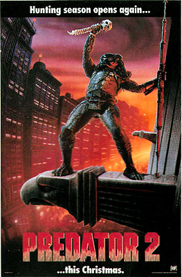 Permit me to begin this review with a confession: I’ve always had difficulty being fair to Predator 2, because it almost completely foreclosed my admittedly eccentric preferred interpretation of the original Predator’s back-story. You see, not long after seeing the first film in its theatrical run, I developed and became enamored of a notion that back on its homeworld, the alien creature that turned six of Earth’s deadliest mercenaries into so many piles of cauterized meat had a day job— and not just any day job, either. I pictured him as, like, a dentist or an actuary or a stockbroker, and imagined that his periodic hunting trips to our planet were his overcompensating reaction to feelings of petit-bourgeois emasculation and ennui. In Predator 2, however, we learn (or at least see it strongly implied) that interplanetary big-game hunting is a central feature of the aliens’ culture, and that they’re an Honorable Warrior Race. You know— like post-“Star Trek: The Next Generation” Klingons, only with even bigger, even lumpier foreheads. I reiterate that it’s unfair for me to grumble about that, because there’s obviously no reason why anybody in Hollywood charged with writing a Predator sequel ought to have taken their marching orders from some teenaged weirdo on the other side of the country, whom they’d never even fucking heard of. But a little grumbling might start to seem justified after all if you turn that writing decision on its side, and look at it from a slightly different angle. That’s because by taking the interpretation of the alien culture that they did, screenwriters Jim and John Thomas (who penned both Predator and Predator 2) fell straight into one of the most irritating tropes in contemporary science fiction. I don’t mean the Honorable Warrior Race per se, although I certainly wouldn’t complain about a temporary moratorium on those. Rather, I’m talking about Orion Slave-Girl Syndrome. OSGS occurs whenever a given sci-fi franchise reintroduces an alien species previously exemplified by a single individual, in such a way as to reveal that whatever that one individual happened to be doing was stereotypical of his, her, or its entire civilization. The Star Wars Expanded Universe is probably the most egregious and persistent offender, but the most obvious single example I can think of (in honor of which I’ve named the phenomenon) is the green-skinned exotic dancer shown briefly in the original, unsuccessful “Star Trek” pilot. The females of her race, the Orions, were described at the time as savage, animalistic, and sexually insatiable, but there was nothing inherent in that gloss to require them all to be space harem girls. Yet every time the series introduced an Orion character after that, a space harem girl was exactly what she was, until “Star Trek: Enterpise” went so far as to posit that Orion society generally was set up along quasi-Gorean lines. (The subsequent revelation that the female Orions were topping from below does not absolve the writers of the underlying sin.) It’s lazy, cheesy, and lame, and it unnecessarily limits the range of stories that a given fictional culture can be used to tell, even beyond what comes naturally from the pressure toward endlessly reiterative sequels that affects all franchise media. So with OSGS in full effect, the brief glimpse into an extraterrestrial culture ends up being the least interesting thing about Predator 2, because it shows us nothing that we couldn’t have guessed with the bare minimum of mental effort. But although Orion Slave-Girl Syndrome is the aspect of Predator 2 that most irritates me, it isn’t the flaw that most seriously hurts the film. What hurts it most seriously is that the Thomases had three terrific premises for a Predator sequel, plus one sort-of-okay one, but instead of settling on any of those, they tired to use the whole lot at once. Three of Predator 2’s four premises— “What if the Predator went hunting in a city?” “What if the Predator intervened in a war between international drug cartels?” and “What if Predator had been a RoboCop-flavored near-future dystopian satire?”— crash headlong into one another during the very first scene. In 1997, Los Angeles is being torn apart by the ever-escalating war between Colombian drug gangs loyal to a man called El Scorpio (Henry Kingi, from Vampires and K-9000) and a newly arrived Jamaican mob known as the Voodoo Posse, led by the mysterious King Willie (Calvin Lockhart, of Cotton Comes to Harlem and The Beast Must Die). While loudmouthed populist media gadfly Tony Pope (loudmouthed populist media gadfly Morton Downey Jr.) and an assortment of comparatively legitimate TV reporters bloviate from the sidelines, a squad of cops under the command of Lieutenant Mike Harrigan (Danny Glover, from Day of the Mummy and Saw) are getting their asses handed to them by some of El Scorpio’s followers in a raid gone badly awry. Then suddenly, after the gangsters withdraw into their base of operations to regroup in response to a fresh sally by the police, persons unknown drop into the building through one of several huge skylights, and kill the lot of them with seemingly impossible speed. By the time Harrigan’s forces make their way inside, all the criminals’ curiously mutilated corpses are strung up by their ankles from the ceiling of the warehouse space on the top floor. The destroyed skylight is much too high up to have been usable as a means of ingress by anyone without climbing equipment, and none of the cops can figure out how enough men to do so much damage so quickly could have left the building without somebody seeing them. Yet they certainly are gone now. In point of fact, though, the lieutenant did see something; he just doesn’t know what it was. Up on the roof, while pursuing the one gangster who temporarily managed to escape the inexplicable massacre, Harrigan saw a sort of man-shaped shimmer, as if