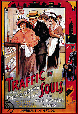 Sex sells. It always has, and everyone knows it. But how do you capitalize on that in a medium that has been given the shortest of legal leashes (cinema was deemed unworthy of First Amendment protection until 1952 in the United States, to say nothing of censorship regimes abroad), within a culture that treats the very word as taboo? It took a lot of ingenuity to resolve that conundrum, and the solution initially arrived at in this country was such that it takes a practiced eye to recognize the earliest generation of American sexploitation movies for what they are. The secret, it turned out, was to make the audience do all the heavy lifting, to seed their heads with salacious thoughts while keeping the screen itself unsullied by anything that even the bluest nose could sniff out as objectionable. Obviously that was quite a challenge. It took a con artist’s instinct for emotional manipulation, a magician’s mastery of sensory misdirection, and a lawyerly gift for lying by telling the technical truth. It also took a convincing pose of scolding moralism, to get the busybodies thinking you were really on their side. Naturally, the technique was refined as time passed, while the hucksters of exploitation tested the tolerances of censors and audiences alike, but the film that first showed the industry how it was done was George Loane Tucker’s Traffic in Souls. That’s “traffic” as in sex trafficking, at least as hot a topic 100 years ago as it is today. The early 20th century’s mania over “white slavery” (to use the terminology of the age) brought together an extraordinary confederation of strange bedfellows, uniting suffragettes and patriarchal reactionaries, labor activists and immigrant-bashers, traditionalists and utopian social reformers. Each party had its own preferred framing for the issue, of course (all of them tending to efface the distinction between sex trafficking and prostitution in general), but if you put them all together, the resulting narrative forms a virtual Rosetta Stone of the era’s social anxieties: girls from the countryside, drawn by the twin lures of economic independence and a broader menu of lifestyle options, were leaving home for the big cities, where foreign-born criminals were tricking or forcing them into de facto indentured servitude as prostitutes, and laundering their ill-gotten gains through renegade banks with the collusion of corrupt police and politicians. In 1910, the concerted public pressure moved Congress to pass the Mann Act, which forbade the transnational or interstate transport of “any woman or girl for the purpose of prostitution or debauchery, or for any other immoral purpose.” (It’s still on the books today, although it’s been modified significantly since then. Among the changes, the current version is gender-neutral, and seeks to control child pornography as well as sex trafficking in the ordinary sense.) But passage of the law by itself did nothing to diminish the prominence of white slavery in the national conversation, and that brings me back to our real topic here. When Tucker approached Carl Laemmle Sr. with the idea for a movie about sex trafficking, the latter man’s fledgling Universal Studios had never produced a feature-length film. Indeed, the entire concept of “feature length” was relatively new to American cinema, and was somewhat mistrusted by both producers and exhibitors. Would the proles who constituted the main audience for movies really want to sit still in a dark room for more than an hour at a stretch? And even if they did, could theaters still earn a profit with the audience turnover rate (closely related to the volume of ticket sales) cut by as much as two thirds? No one could yet say as a general thing, but again, sex sells. If anything was worth the gamble of bringing Universal into the feature business, an in-depth treatment of a lurid topic that had already held the public’s attention for years was it. Just to be sure, Laemmle also rolled out some inspired carny-style ballyhoo, inflating the reported production cost by a factor of 30, and claiming that Traffic in Souls was based on the official report of some imaginary New York state commission to study the problem of white slavery. The bet paid off handsomely. Universal made so much money that there was no longer the slightest doubt about features becoming a regular part of the company’s business model, and other producers ranging from the biggest of the big studios to the most disreputable minor-league roadshow peddler began studying Traffic in Souls for clues on how to duplicate its success. It would be some years before Universal ascended from what would later be called Poverty Row, and many more years still before the likes of Dwayne Esper and Kroger Babb raised sexploitation to its first plateau of maturity, but both of those seemingly contrary processes begin here. Filling six reels must have seemed a daunting task to filmmakers accustomed to working with only one or two at a time, so it shouldn’t surprise us that Traffic in Souls labors under the burden of far more story than it really needs. There are two main plot threads which merge at roughly the hour mark, but also what amounts to a complete short subject wedged awkwardly into the middle of the film. Subplot A concerns Mary (Jane Gail, from the 1916 20,000 Leagues Under the Sea and the King Baggot version of Dr. Jekyll and Mr. Hyde) and Lorna (Ethel Grandin) Barton, daughters of a somewhat dotty widower (William H. Turner) who is identified from the outset as an inventor, but whose talents will not come into play until the movie is nigh over. The girls both work at Smyrner’s Candy Store, and the elder is dating a policeman named Burke (Matt Moore, of I Bury the Living and Tod Browning’s The Unholy Three). One afternoon at work, Lorna catches the eye of a pimp (William Conaugh) who decides that she’d be the perfect addition to his stable. The pimp and his bosse